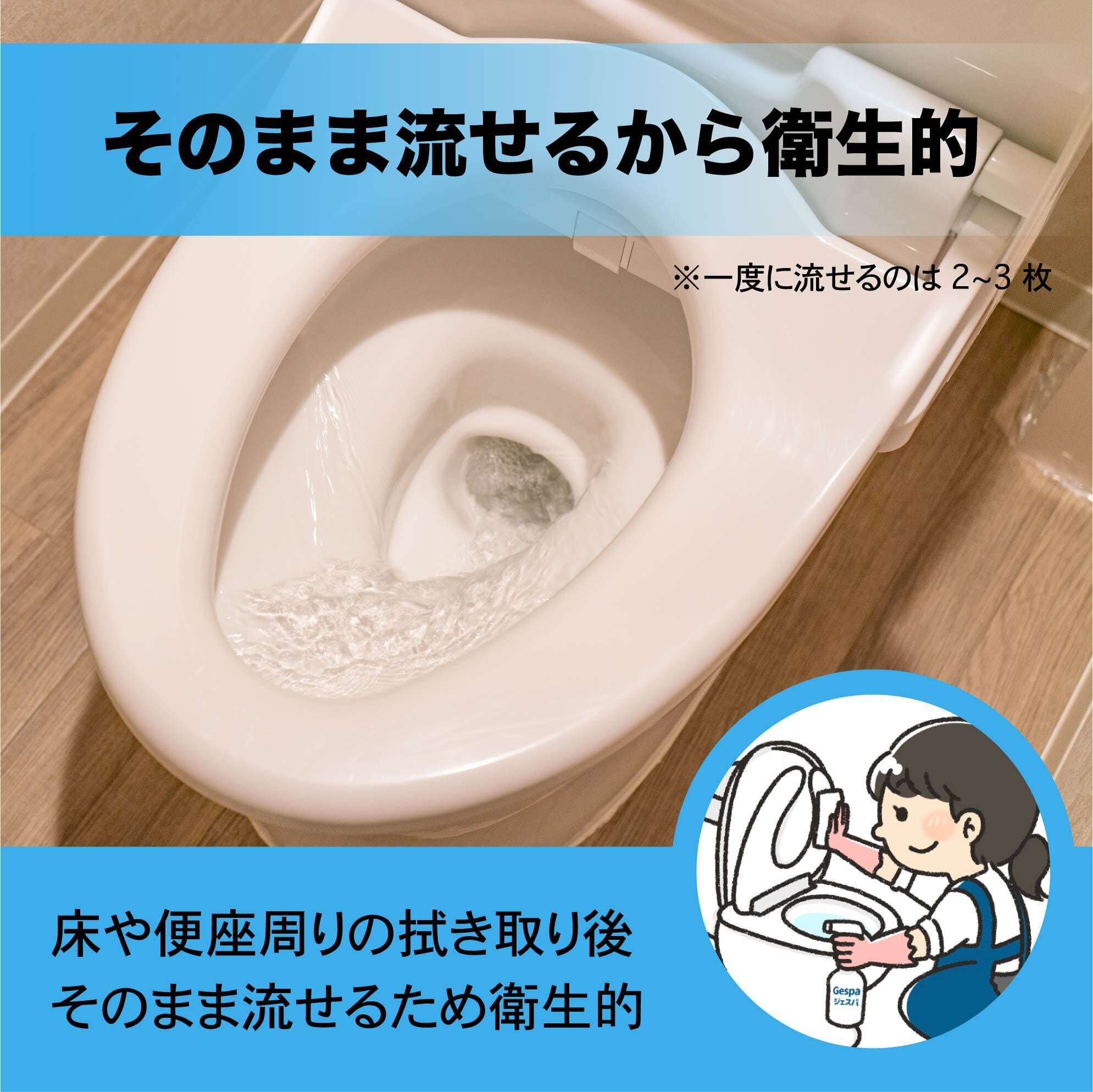 トイレ掃除では、床や便座周りの拭き取り後にそのまま流せるため、ゴミの処理が不要に。特に病院や福祉施設、食品工場などでは、衛生管理が簡単になり、清潔さを維持しやすくなります。
