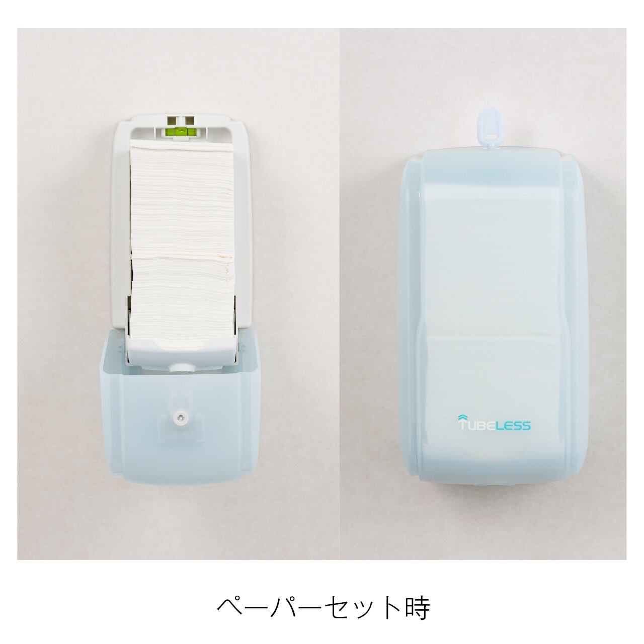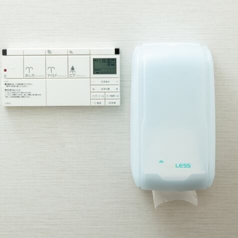 通常のトイレットペーパーロールと異なり、シート型のトイレットペーパーを格納して使用します。